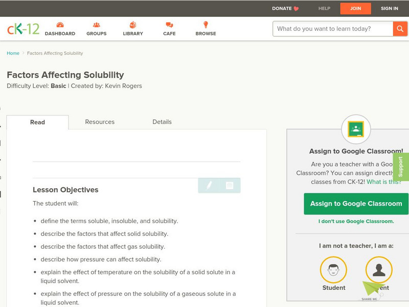 [Free Registration/Login may be required to access all resource tools.] Through readings, videos clips, and review questions, study the factors that affect solubility.