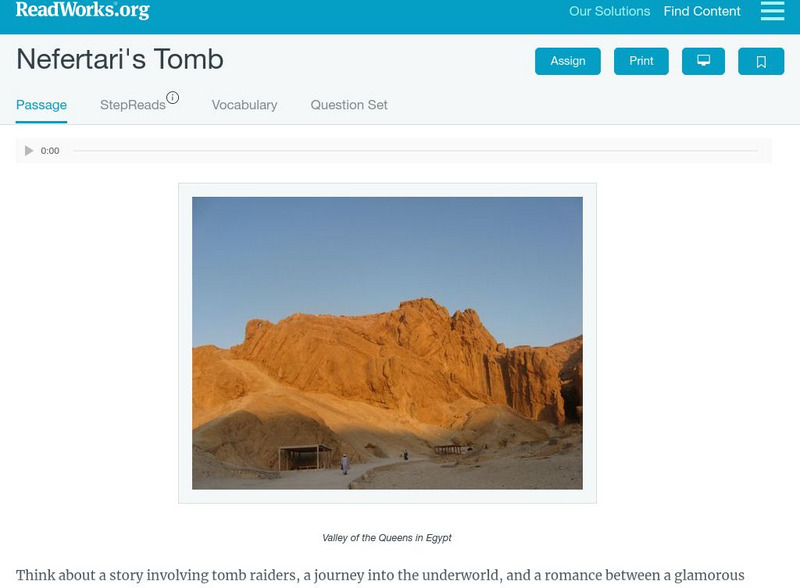 [Free Registration/Login Required] This five-page PDF nonfiction passage "Nefertari's Tomb" by Alizah Salario discusses how the tombs of the Ancient Egyptians provide information about their culture. It is followed by 10 comprehension...