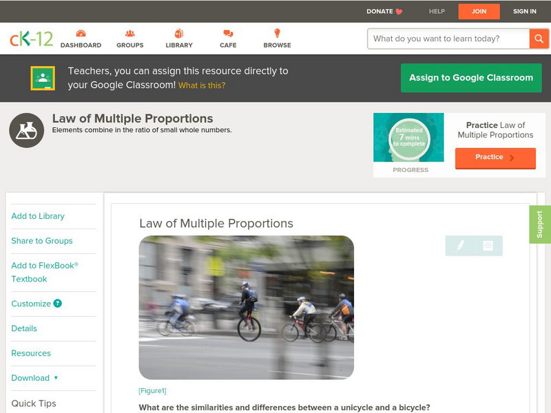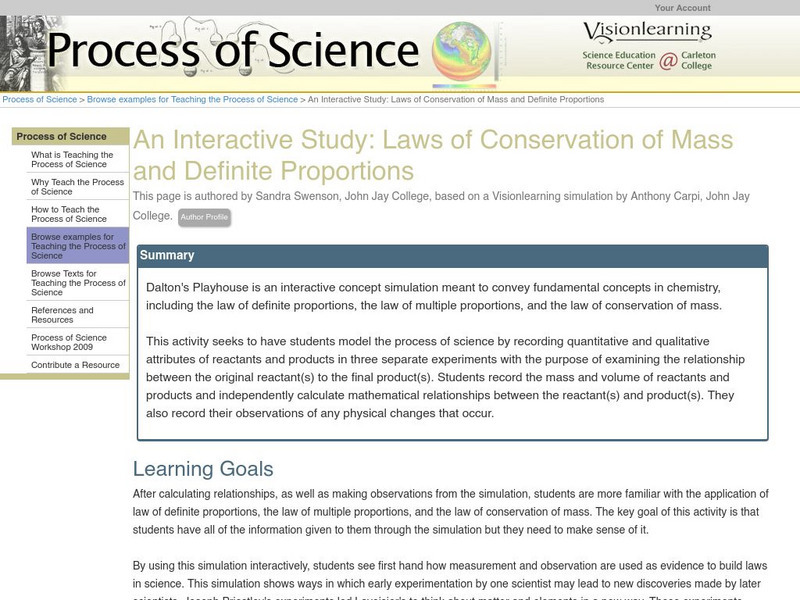 [Free Registration/Login may be required to access all resource tools.] In this online tutorial students will explain the law of conservation of mass, the law of definite proportions, and the law of multiple proportions. They will also...