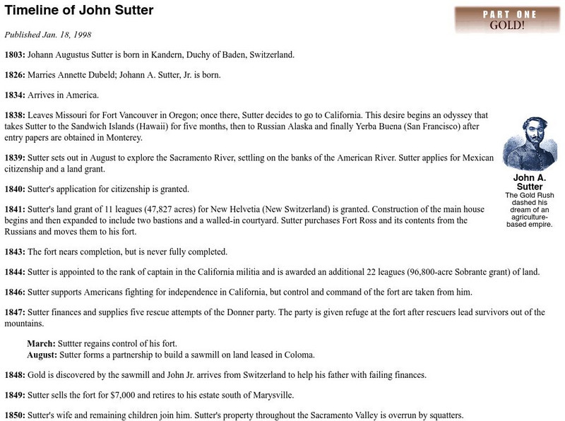 John Sutter was the unwitting lynchpin in the California Gold Rush. Read the time line of events that show how he suffered for that discovery.