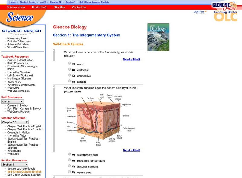 Glencoe Biology: The Integumentary System: Self Check Quiz