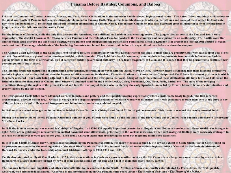 This page is an article about the Pre-Colombian period of Panamanian History. "Prior to the Conquest of Central America, Mexico, and Peru, Great Civilizations in the Americas had developed high cultural values."