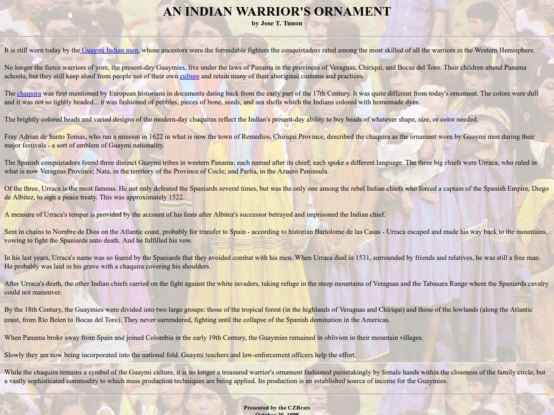 This page is an article entitled "An Indian Warrior's Ornament," by Jose T. Tunon. It contains information about the Spanish conquistadors (colonial period of Panama's history.) There are also links to great photos.