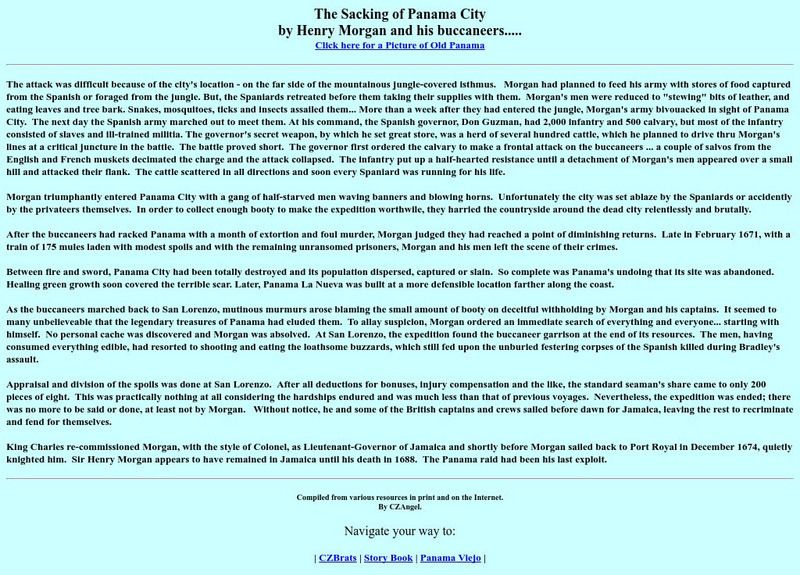 This page is an article about the Sacking of Panama City by Henry Morgan and his buccaneers. Includes links to pictures of Old Panama.