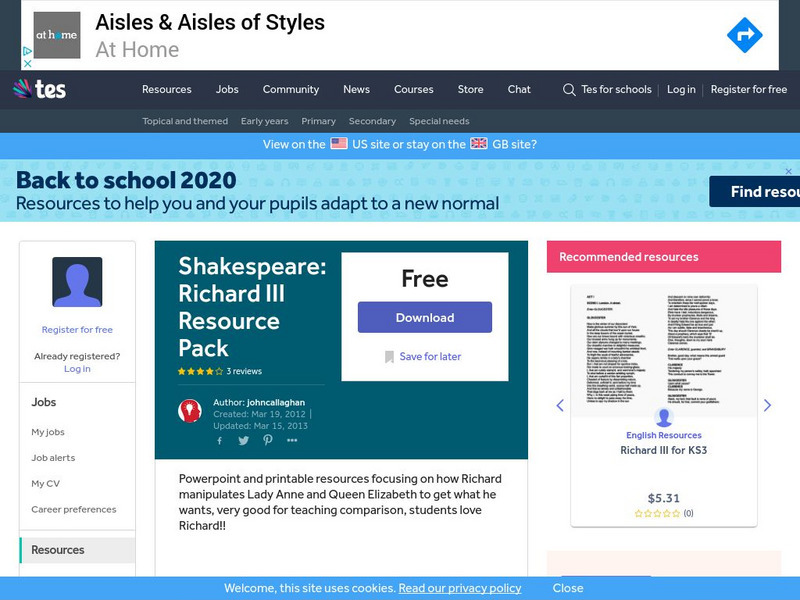 [Free Registration/Login Required] This is resource material for teaching Shakespeare's Richard III including activities and writing assignments. They focus on how Richard manipulates Lady Anne and Queen Elizabeth to get what he wants.