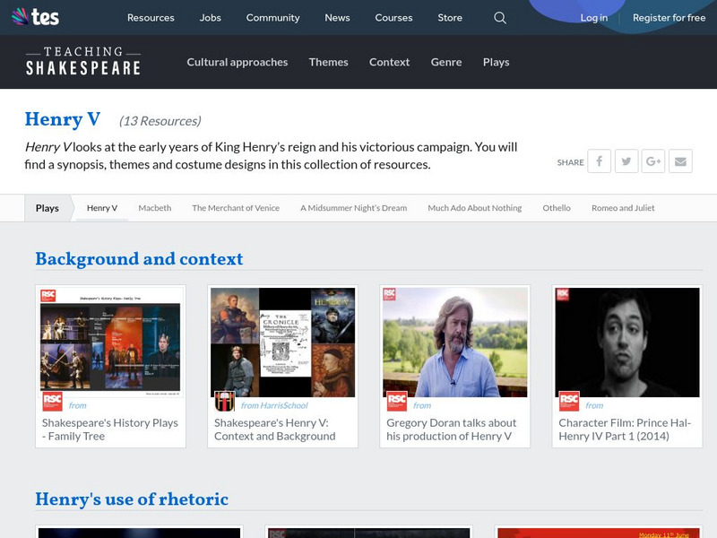 [Free Registration/Login Required] This collection looks at the early years of King Henry's reign and his victorious campaign; it includes video clips, a synopsis, themes, costume designs, and historical background.