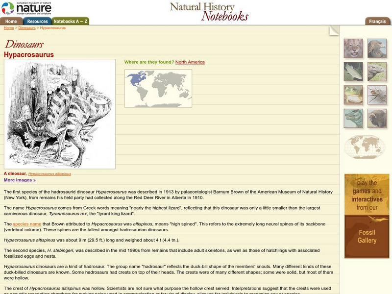 The large Hypacrosaurus dinosaur is detailed here by the Canadian Museum of Nature.