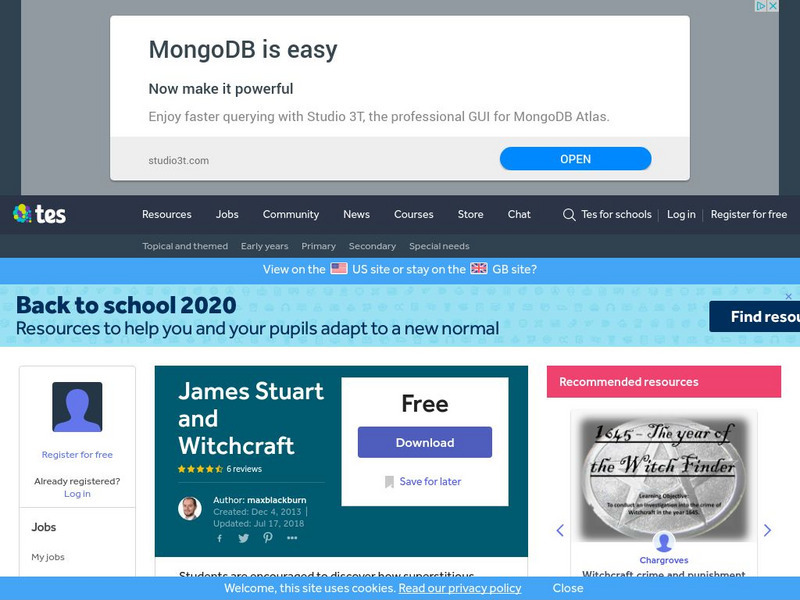 [Free Registration/Login Required] This lesson focuses on King James I and his belief in witchcraft. It includes information and activities about witches, conducting research about James's superstitions and his book Deamonologie, and...
