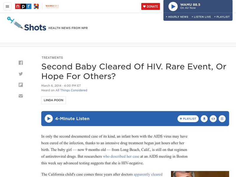 Article and an interview with the Director of the National Institute of Allergy and Infectious Diseases discusses the recent report of a second baby cleared of the HIV virus by a regimen of antiretroviral drugs abd what implications this...