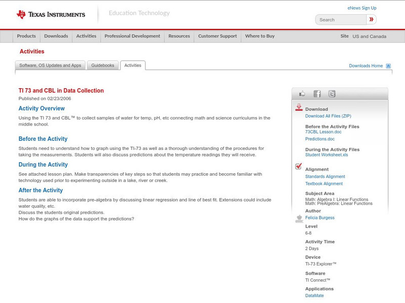 Using the TI 73 and CBL to collect samples of water for temp, pH, etc connecting math and science curriculums in the middle school.