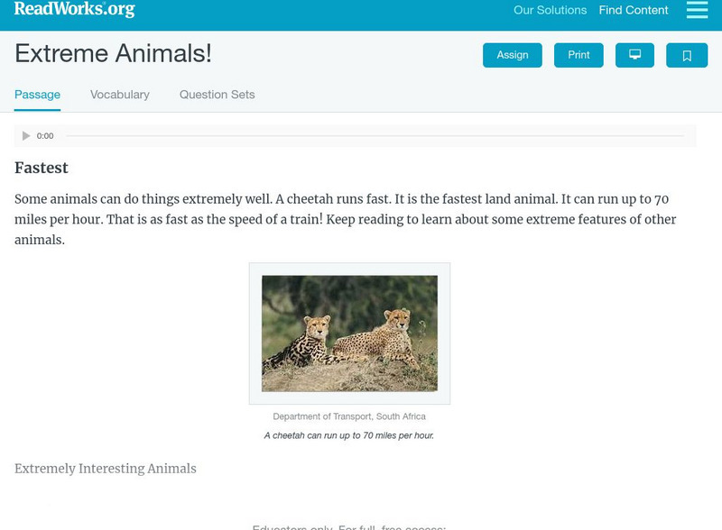 [Free Registration/Login Required] This informational text passage shares extreme animal facts. This passage is a stand-alone curricular piece that reinforces essential reading skills and strategies and establishes scaffolding for...