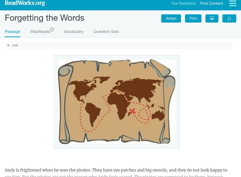 [Free Registration/Login Required] Students read a fiction text about a boy named Andy who has a part in the school play and answer questions about comprehension, conflict, inferencing, main idea, literary devices, and more. Links to a...