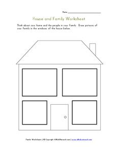 In this house and family worksheet, students draw pictures of the members of their family in the windows of the house drawn on the page.