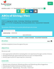 Students investigate ways to practice philanthropic acts at home. They record the activities they choose to participate in and the accomplishments they experience.
