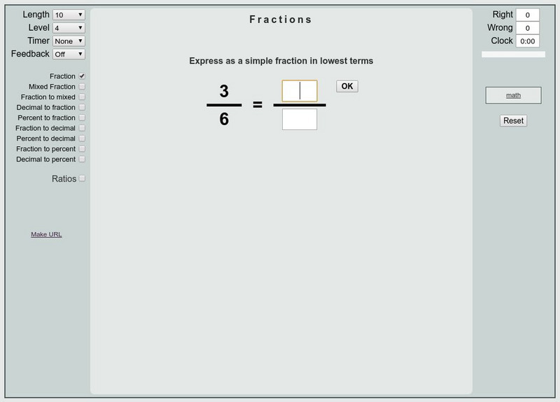 This resource allows users to test their knowledge of fractions. Express fractions, mixed fractions, decimals, percents and ratios in lowest terms.