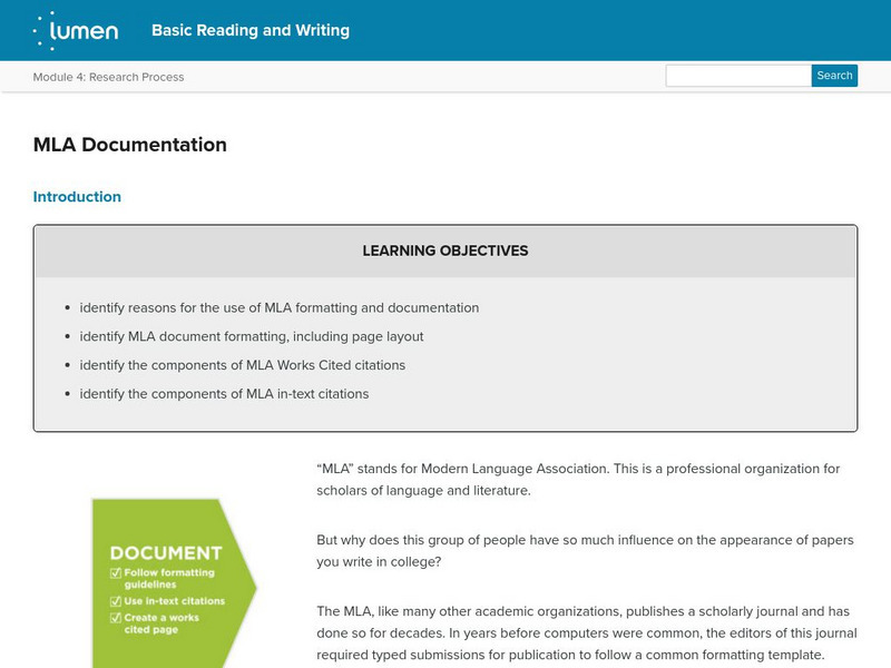 This instructional activity focuses on MLA documentation including MLA paper formatting, Works Cited citations, and in-text citations. It includes multiple videos and a slide show, a practice activity, and a self-check.