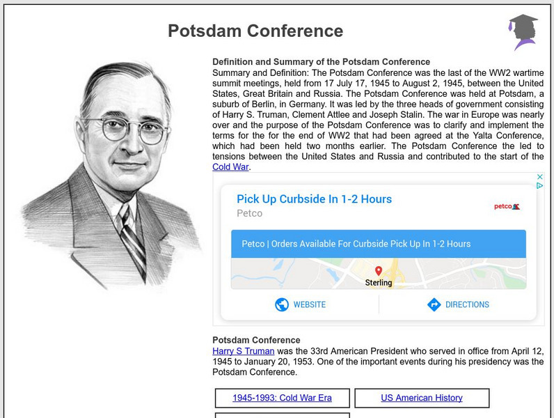 The Potsdam Conference was a wartime summit meeting whose purpose was to clarify and implement the terms for the end of WW2 that had been agreed at the Yalta Conference. It began on July 17, 1945, and ended on August 2, 1945.