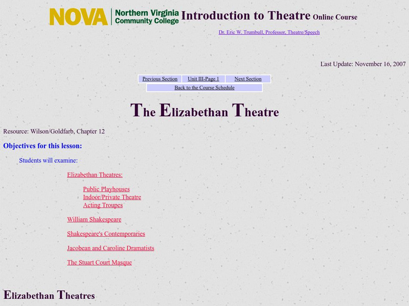 This site mainly discusses the Elizabethan Theatres. It gives statistics about the various theatres of that time period, and provides interesting information about them. Some information on William Shakespeare is also provided.