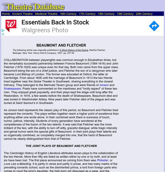 This site from Theatre Database presents a biography of Elizabethan dramatists and collaborators Francis Beaumont and John Fletcher. The information is somewhat in-depth and throughout links are provided for additional information. Also...