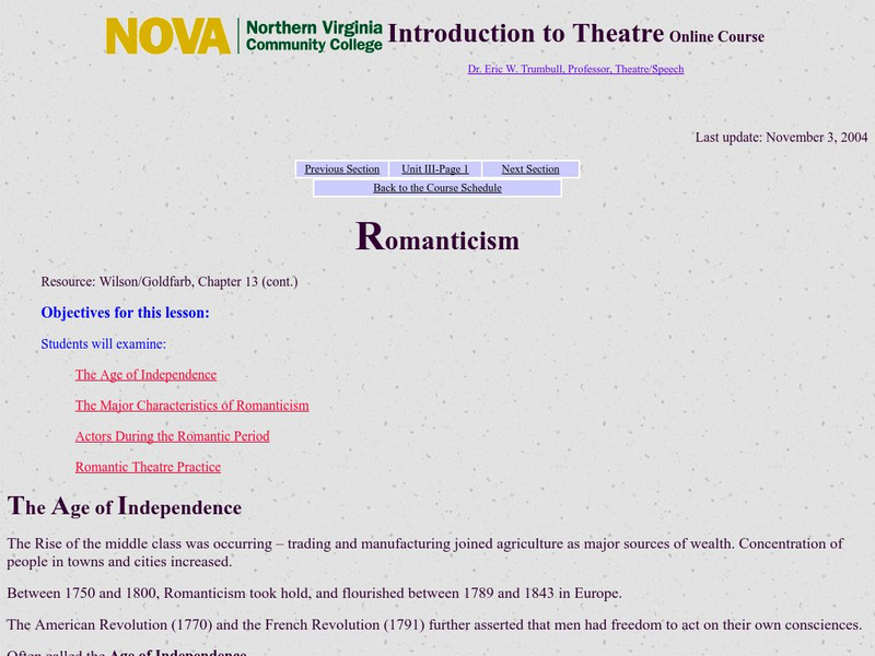 This page presents outline notes on Romanticism in the theatre. It lists and describes the main characteristics of Romanticism, lists some of the main actors of the Romantic period, and includes some general information about the...