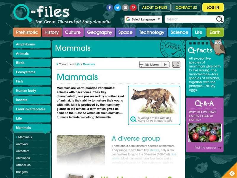 Wikipedia, an open-source encyclopedia, provides great information on mammals. Content includes a look at mammal characteristics, origins, classification, and more.