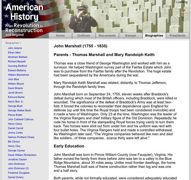 Read an in-depth biography on former Chief Justice, John Marshall. Topics in the biography include his early life, his life during the Revolutionary War, and his term as Chief Justice. Also includes information about major cases in which...