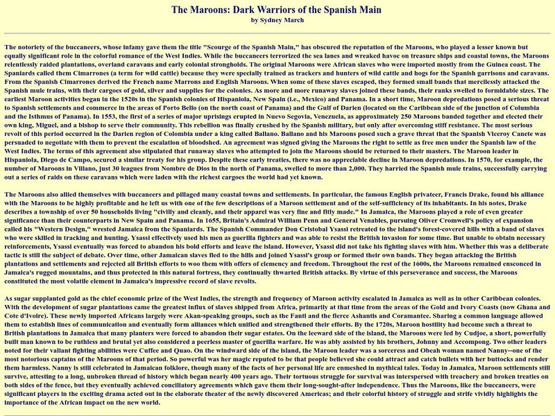 This page is a reprint of an article by Sydney March entitled "Maroons: Dark Warriors of the Spanish Main" which first appeared in the journal "The New World."