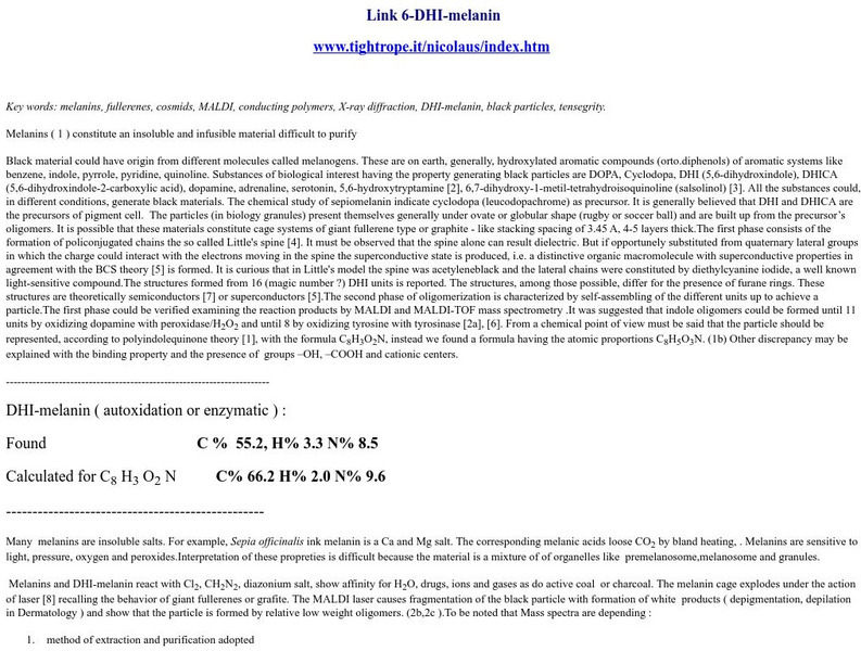 This site concentrates on the chemical structure and chemical properties of melanin. Advanced knowledge of chemistry needed for this personal site from Rodolfo Alessandro Nicolaus.