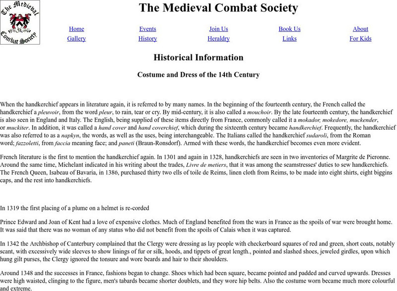 Features historical information regarding how people dressed in 14th century England. Discusses the laws that were passed telling both royalty and commoners what they should and could wear.
