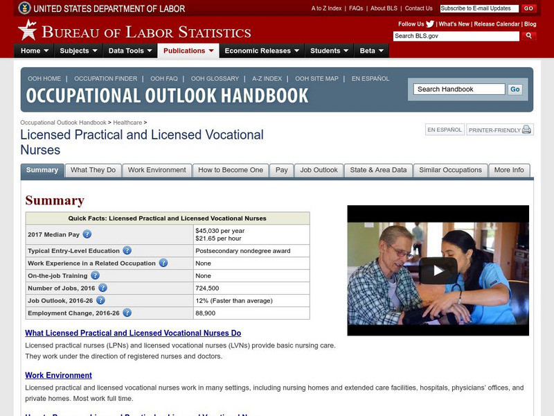 Statistics and a job description for a Licensed Practical and Licensed Vocational Nurses career are researched at this site. This site includes Nature of the Work, Working Conditions, Training, Other Qualifications, Job Outlook,...