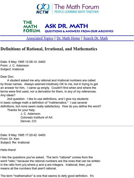 Math Forum definition and explanation of rational and irrational numbers, the definitions of mathematics is also addressed.