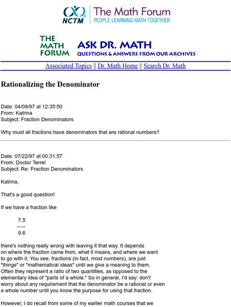 The Math Forum: Ask Dr. Math: Rationalizing the Denominator