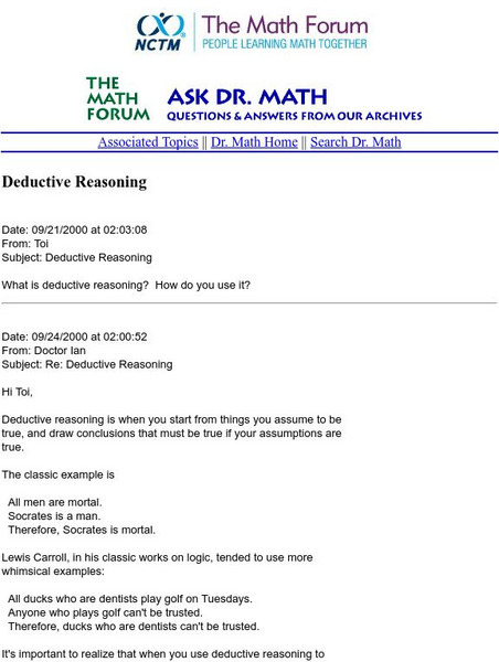 An explanation and description of deductive reasoning in solving problems at this site from The Math Forum. Simple and helpful information.