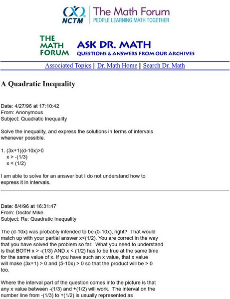 "Dr. Math" responds to a student question about writing solutions to quadratic inequalities in interval form.