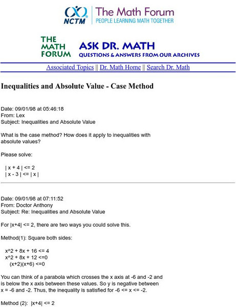 "Dr. Math" responds to a student question on how to use the case method in solving absolute value ienqualities.