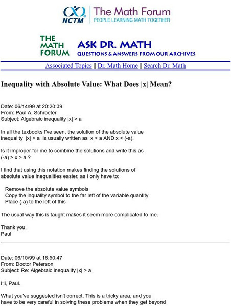 "Dr. Math" presents an in-depth discussion of the meaning of an absolute value inequality. The discussion tries to clarify some of the mis-conceptions surrounding absolute value.