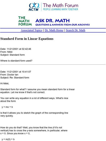 The Math Forum: Ask Dr. Math: Standard Form in Linear Equations Useful