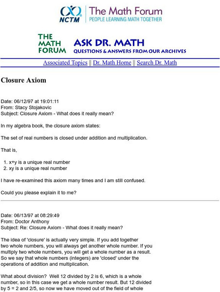 Dr. Math explains the algebraic concept of closure. Dr. Math gives several examples and explains why the set is closed under the operation or not.