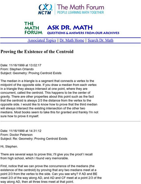 The Math Forum: Ask Dr. Math: Proving the Existence of the Centroid