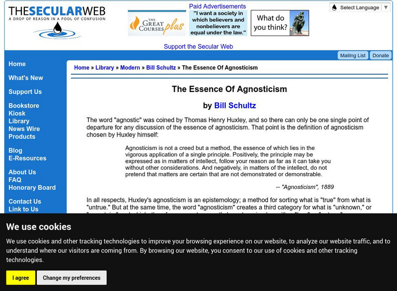 This site cites two quotes from T.H. Huxley, which are then analyzed. Describes the implicit epistemology of agnosticism and distinguishes it from a metaphysical position.