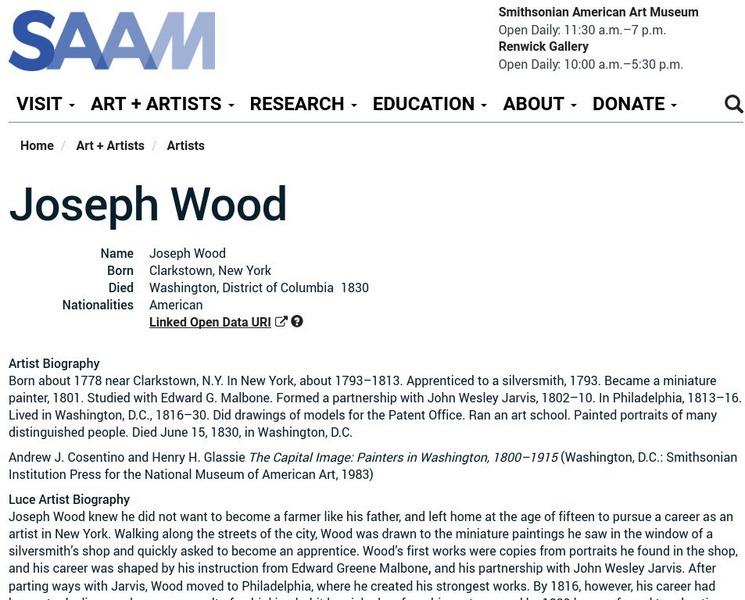 As part of the Smithsonian Art Museum's database of artists, Joseph Wood is described here along with information on his contributions to art through his miniatures and portraits.