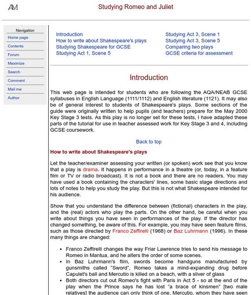 A site from the UK on William Shakespeare's Romeo and Juliet. Complete with information on historical context, stagecraft ideas, thematic elements, and in-depth analysis of the tragedy itself.