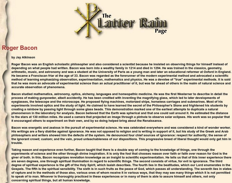 Latter Rain Page: Roger Bacon's Life, Works, Philosophy