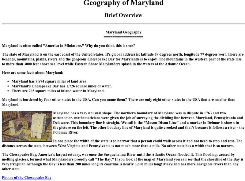 A nice, informative site about the geography of Maryland. Presents numerous facts and a summary of the three land regions of Maryland.