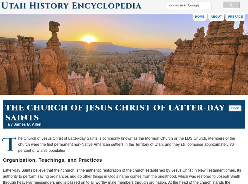 This resource provides information on the Church of Jesus Christ of Latter-day Saints from the Utah History Encyclopedia. Includes discussion of the Church's organization, teachings, practices, and history.