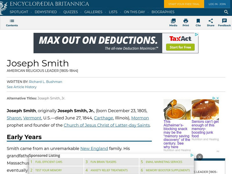 Encyclopedia Britannica presents a biography on Joseph Smith, American prophet whose writings, along with the Bible, provide the theological foundation of the Church of Jesus Christ of Latter-day Saints and other Mormon denominations.