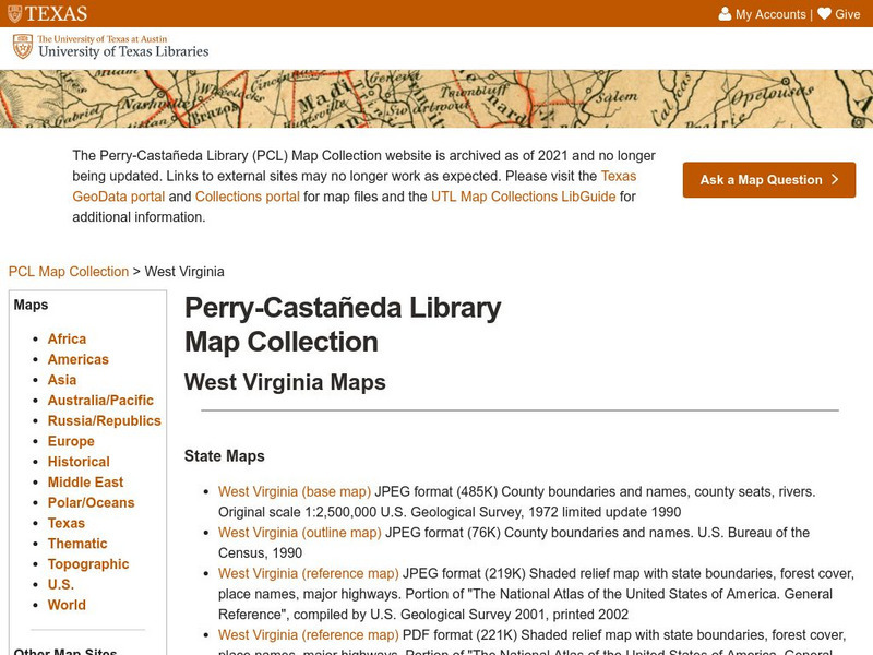 This site from The Johns Hopkins University Applied Physics Laboratory contains a black and white map, a county map, a satellite image map, a shaded relief map. Check out West Virginia's landforms.