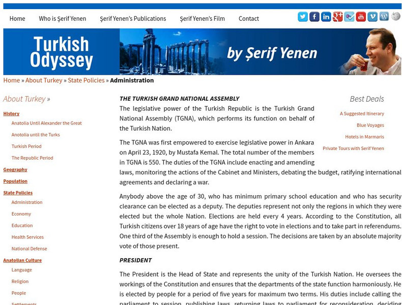 This site describes the government of Turkey. Topics include the Turkish Grand National Assembly, the President, Cabinet, and local administration.