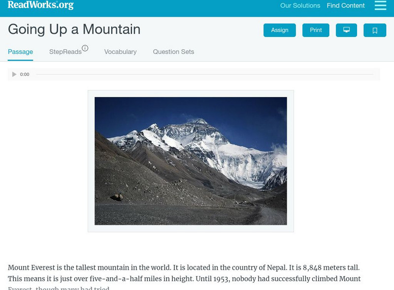 [Free Registration/Login Required] An informational text about climbing Mount Everest. A question sheet is available to help students build skills in reading comprehension.