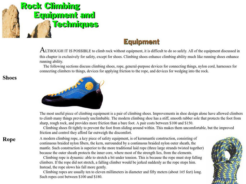 This resource discusses some history of rock climbing but primarily focuses on the basic fundamentals of safe climbing. The information provided is somewhat brief, but links are provided to additional information along with some pictures.